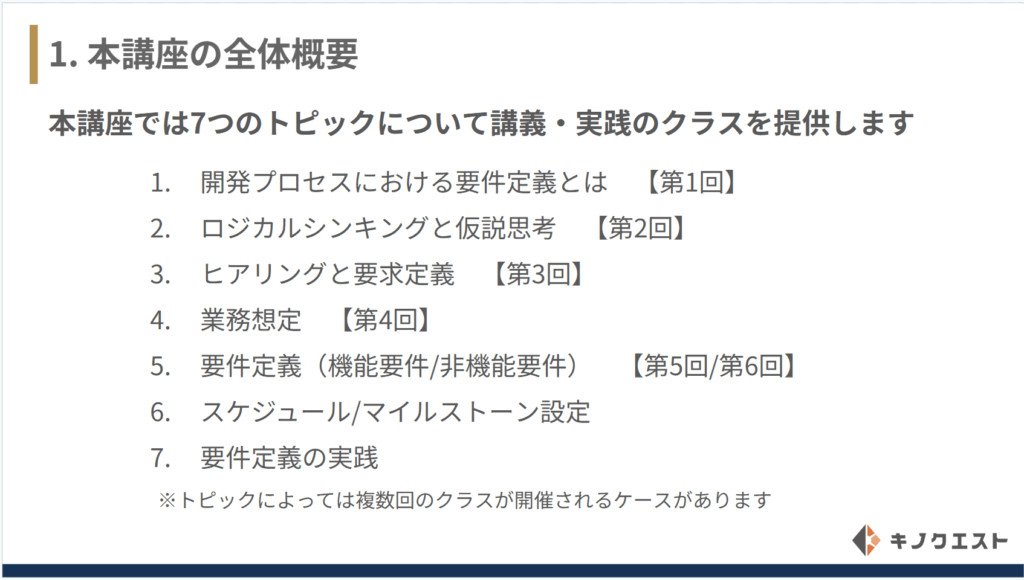本講座では、ITプロジェクトの一連の工程の内容や求められる考え方を学ぶことに重点を置いており、ロジカルシンキングや仮設思考についても学び、最後の演習課題としては一連の工程を実践し要件定義書を作成します。下記のコンテンツを全7~9回での開催を予定しております。